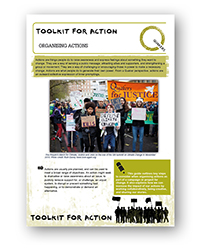 Actions are things people do to raise awareness and express feelings about something they want to change. They are a way of sending a public message, attracting allies and supporters, and strengthening a group or movement. They are a way of challenging or encouraging those in power to make a necessary change. Actions are what people do to generate their own power. From a Quaker perspective, actions are an outward collective expression of inner promptings. This guide outlines key steps to consider when organising actions as part of a campaign or project for change. It also explores how we can increase the impact of our actions by working collaboratively, being creative, and sharing our stories.